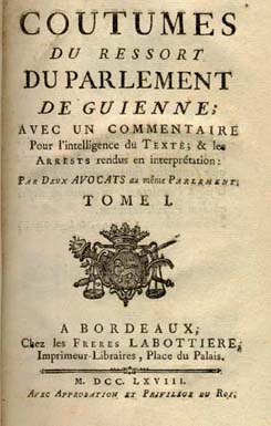 mentionne un autre de 1351. Las Coustumas fournissent des indications préciseuses sur le fonctionnement des juridictions. Que ce soit la magistrature locale : le Prévôt de la ville,(désigné tantôt sous le nom de Prévôt de Bordeaux, tantôt sous celui de Prévôt de Saint-Éloi) qui connaissait de toutes les affaires ou contestations des bourgeois ou habitants de la ville et de la banlieue, tant civiles et criminelle, avec pour juge d'appel,le Maire, président du tribunal de la commune, appelé la Cour de Saint-Éloi, et composé de la Jurade. Ou les représentants de la justice royale : le Prévôt de l'Ombrière, qui tenait ses assises sous les arbres du château de l'Ombrière et exerçait sa juridiction "entre les estrangers complaignants, venants de plus loin que la banlieue de la ville" et le Sénéchal de Bordeaux ou de Gascogne, appelé souvent Châtelain ou Juge des appels, qui tenait au château de Bordeaux une cour solennelle. |
